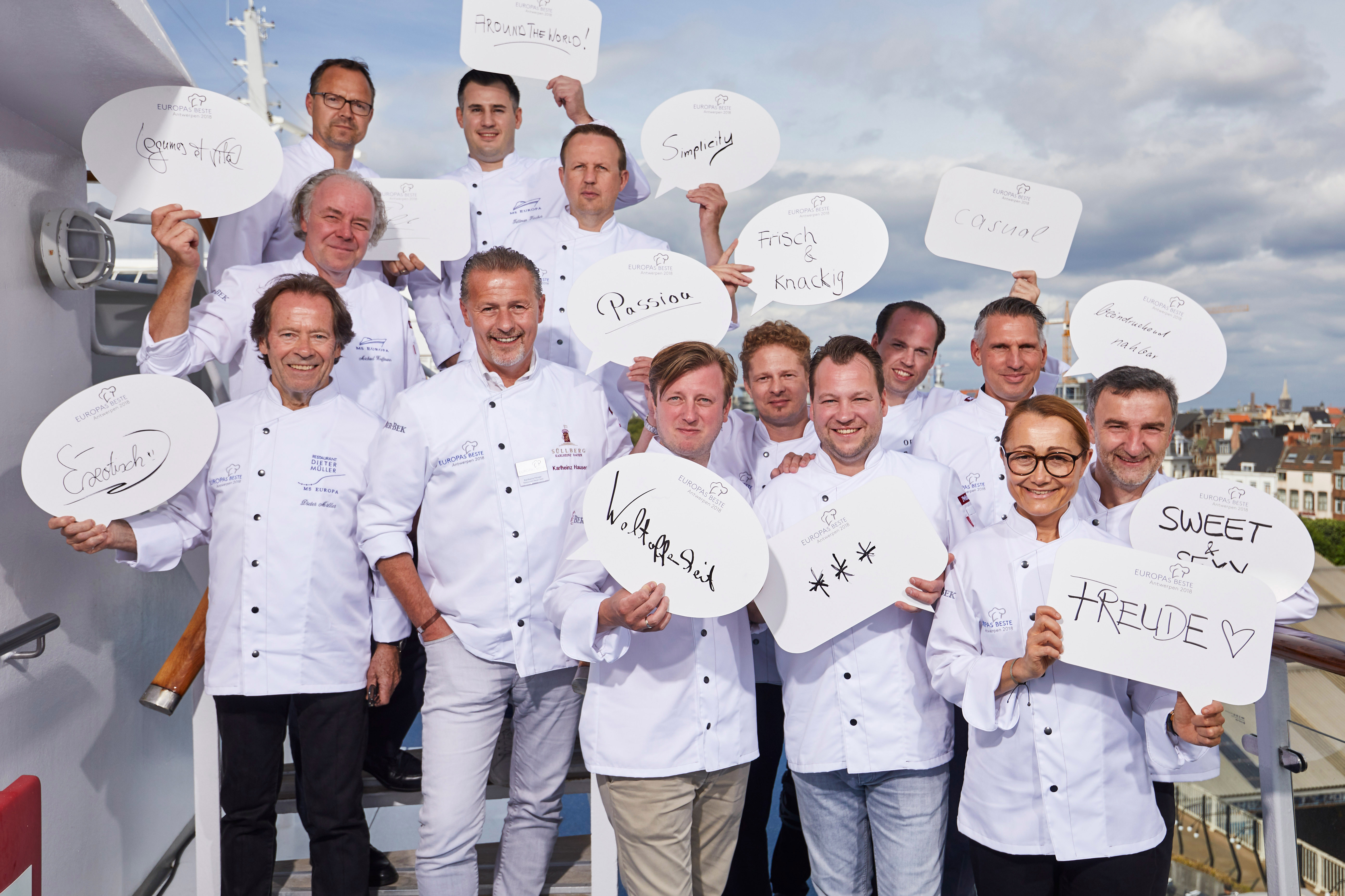 · Festival vor Antwerpen am 24. Juni 2018Mehr als 30 Akteure der Spitzengastronomie kamen bei „EUROPAs Beste“ am 24. Juni auf dem Lido Deck zusammen und begeisterten die Gäste mit besonderen kulinarischen Kreationen. 13 europäische Spitzenköche, Winzer, Chocolatiers, Pâtissiers und Fromagers machten das Gourmetevent zu einem wahren Genussfeuerwerk. Unter ihnen auch TV-Moderator Günther Jauch, der die Weine seines Weinguts von Othegraven präsentierte. Der Küchenchef von MS EUROPA, Tillman Fischer, hieß die Gourmetelite gemeinsam mit Corporate Chef Michael Hoffmann an Bord des Luxusschiffes von Hapag-Lloyd Cruises willkommen.