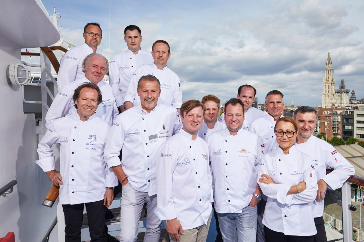 Bereits zum siebten Mal machte die EUROPA für den kulinarischen Eventabend, der sowohl bei den Passagieren, als auch der Gourmetelite als Veranstaltungshighlight zählt, vor Antwerpen fest. Die Gäste flanierten an den Live-Cooking Stationen und genossen die vielfältigen Kreationen. So gab es bei Jan Hartwig beispielsweise „Jakobsmuscheln mit Essigkarotten, Eiskraut, Sesam & Dashi-Schnittlauchbutter“. Kevin Fehling präsentierte „Glasierten Aal mit Dashi, Reisschaum, Wasabi & Forellen-Kaviar“. „Zander Zitronen Ceviche, Kurkuma und Fenchel“ gab es bei Tanja Grandits. Mit dabei waren in diesem Jahr:
