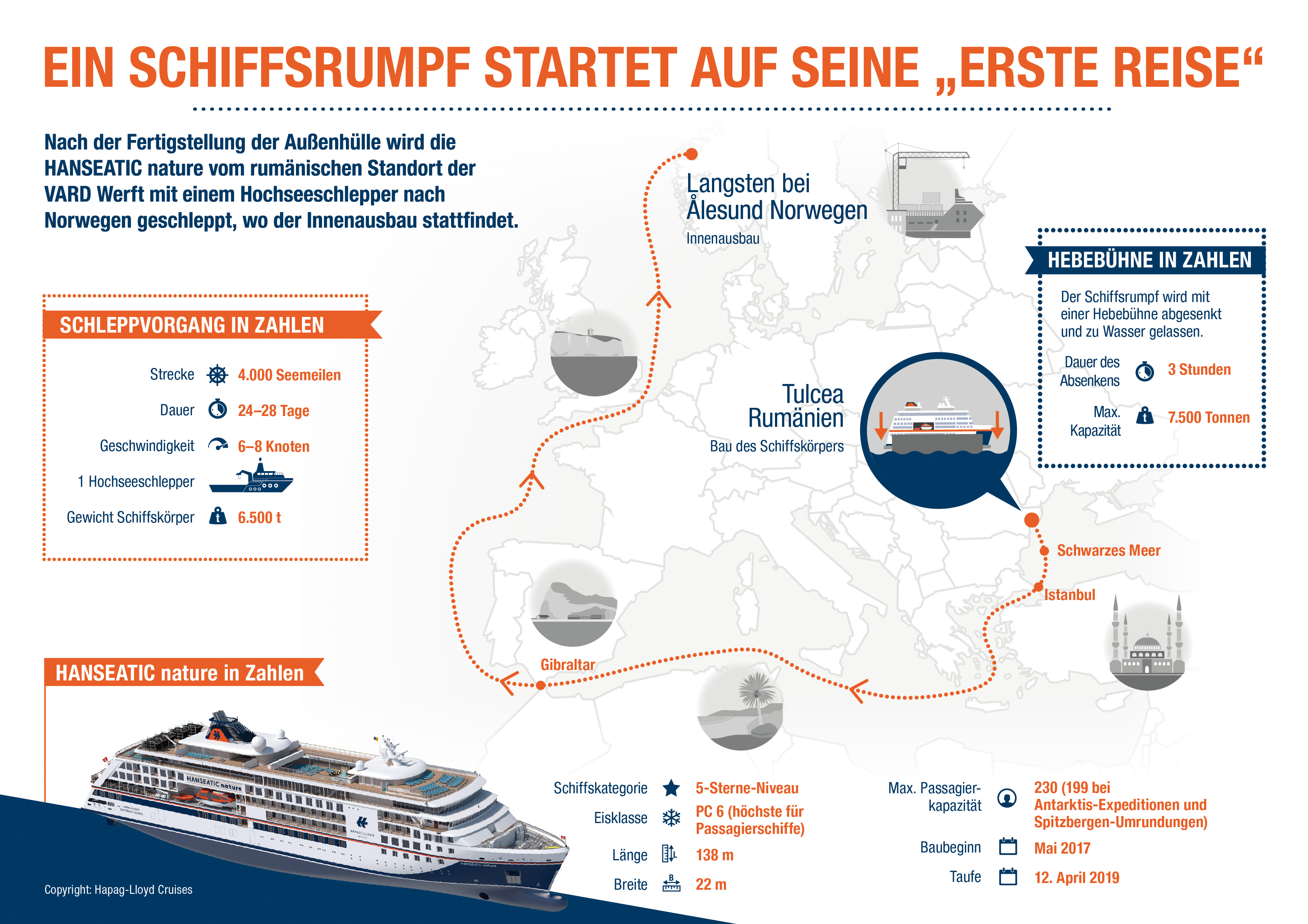Wichtiger Meilenstein im Bauprozess der HANSEATIC nature von Hapag-Lloyd Cruises: Heute, am 26. Juli 2018, beginnt die Überführung des Expeditionsneubaus vom rumänischen Standort der VARD Group in Tulcea zur VARD Langsten Werft in Norwegen. Seit Baubeginn im Mai 2017 wurde die Außenhülle der HANSEATIC nature in Rumänien fertiggestellt. Der Innenausbau erfolgt in Norwegen.