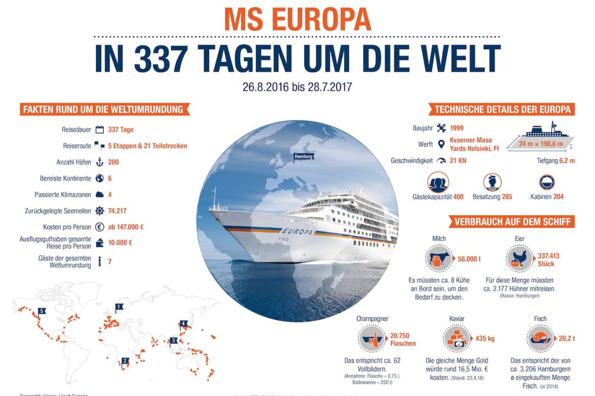 200 Häfen auf sechs Kontinenten besucht MS EUROPA im Rahmen der Weltumrundung und passiert auf ihrer Reise insgesamt vier Klimazonen. In 337 Tagen legt das Luxusschiff 74.217 Seemeilen zurück, bevor am 28. Juli 2017 die Weltumrundung in Hamburg zu Ende geht. Für die Versorgung der maximal 400 Gäste an Bord, von denen sieben die komplette Weltumrundung gebucht haben, benötigt die Crew 56.000 Liter Milch. Dazu kommen 337.413 Eier, 435 Kilogramm Kaviar und 95,4 Tonnen Fleisch. Am Ende der Weltumrundung werden die 49 Köche an Bord der EUROPA zudem circa 20,2 Tonnen Fisch und 16,3 Tonnen Krustentiere verarbeitet haben.